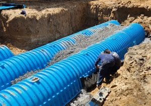 - Excavation and installation of pipes, aggregate envelope, and structural components.